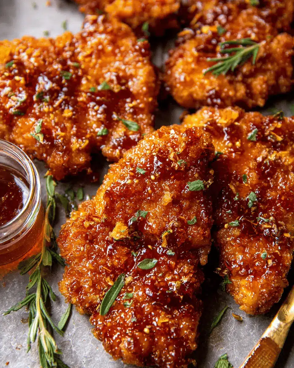 If you’re looking to elevate your chicken dish into a fresh, herbaceous delight, consider infusing it with herbs. Add finely chopped fresh thyme or parsley to the cornflake crumb mixture for a savory aroma and flavor. You can also drizzle some olive oil infused with rosemary before baking for an extra layer of taste that perfectly complements the sweetness of the hot honey.