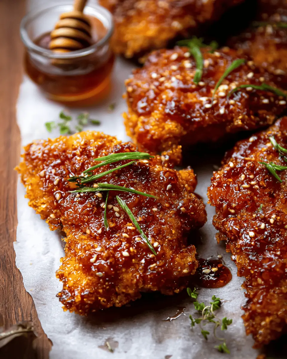 Once baked, drizzle the hot honey sauce over the crispy chicken and garnish with fresh herbs. Enjoy every flavorful bite of this easy, crunchy delight!