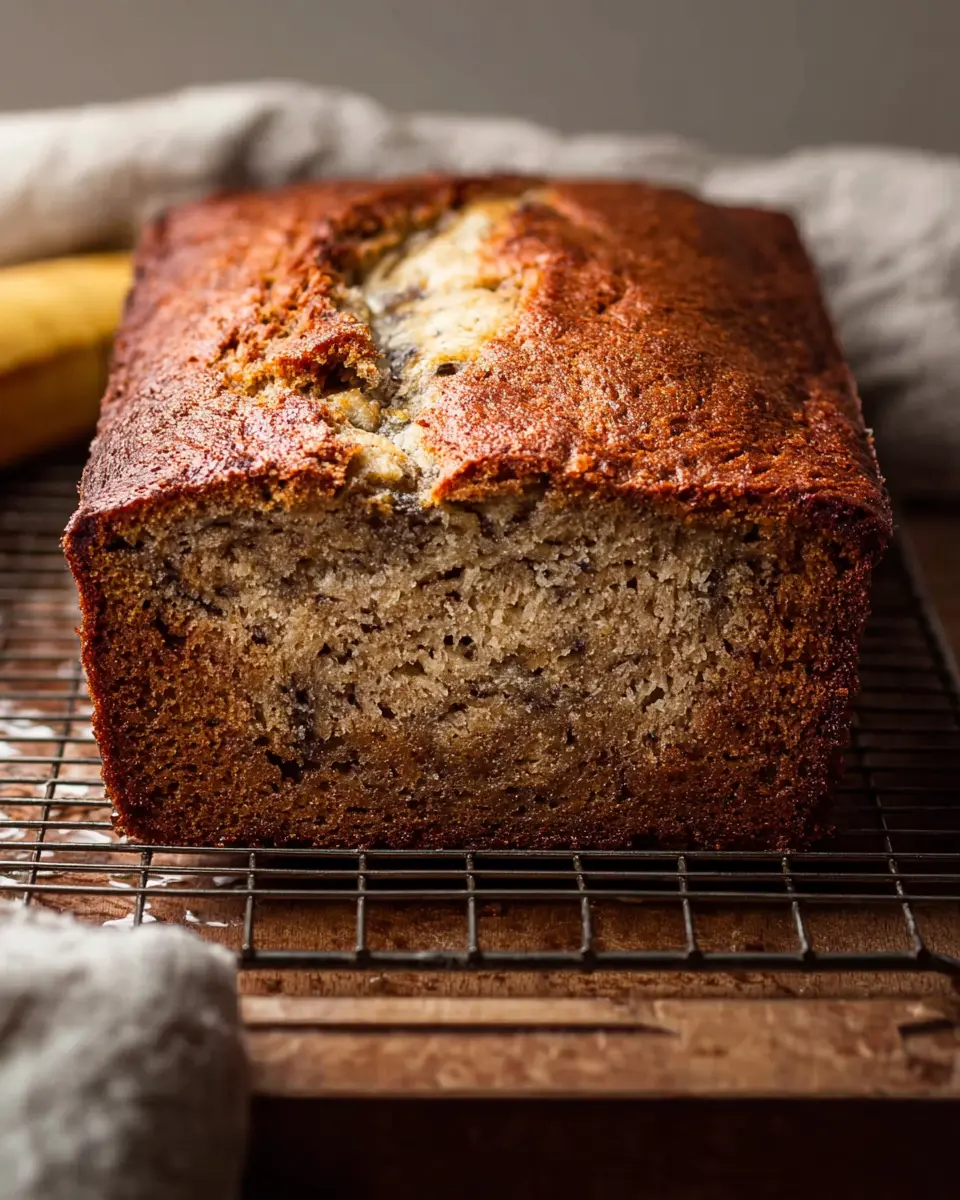 One of the best tests for doneness is the old toothpick trick! Insert a toothpick into the center of the loaf—if it comes out clean or with just a few dry crumbs, your banana bread is ready. Keep an eye on the color; if it’s browning on the outside but still gooey in the center, loosely cover it with foil and continue baking until fully cooked.