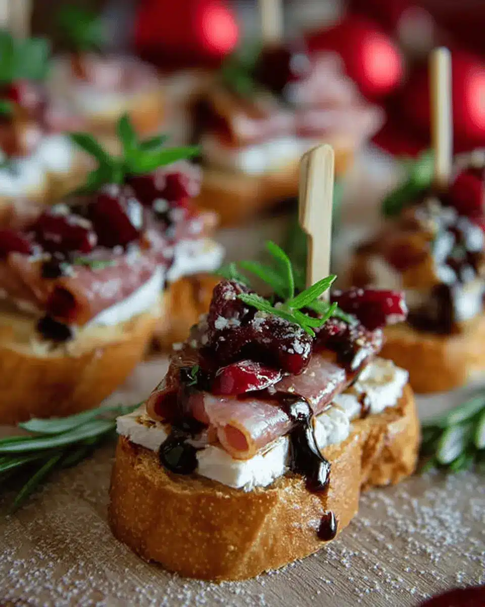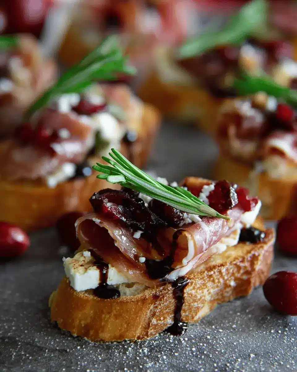 Brie, Cranberry and Prosciutto Crostini with Balsamic Glaze
