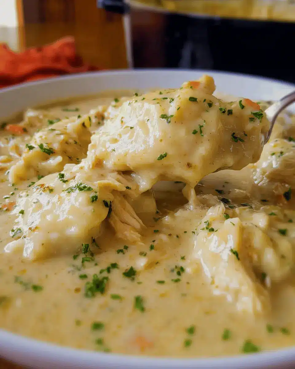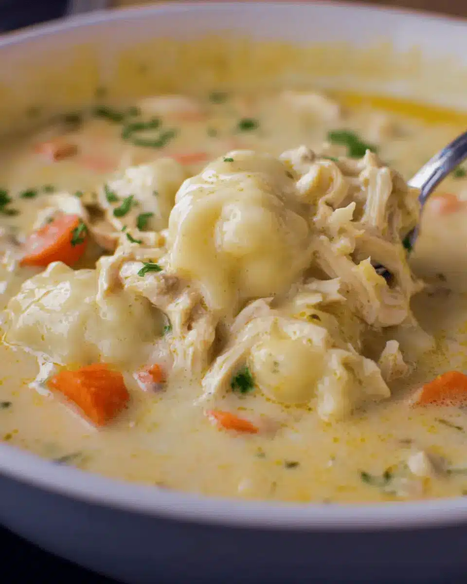 While that’s happening, shred the cooled chicken, and once the dumplings are puffy and perfect, return the chicken to the pot. Pour in the milk, mix well, and let it sit for a final five minutes off the heat. This step ensures everything melds together beautifully.
