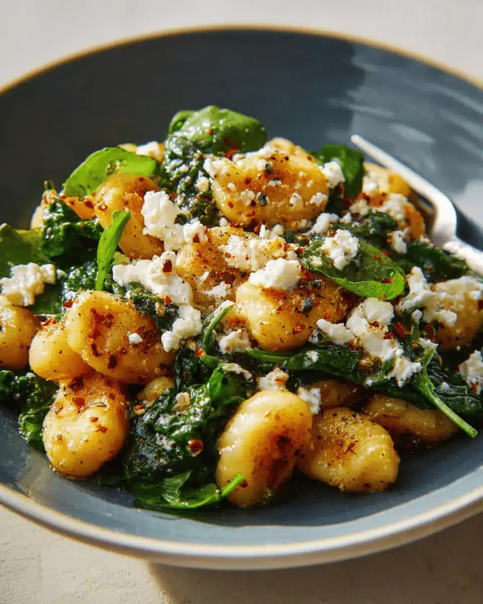 What really sets crispy gnocchi with spinach and feta apart is the contrast in textures. The gnocchi offers a satisfying crunch on the outside while remaining pillowy on the inside. Meanwhile, the fresh spinach keeps its leafiness, and the feta adds a creamy saltiness that elevates the entire dish. This combination doesn’t just taste great; it’s also a celebration of colors on your plate.