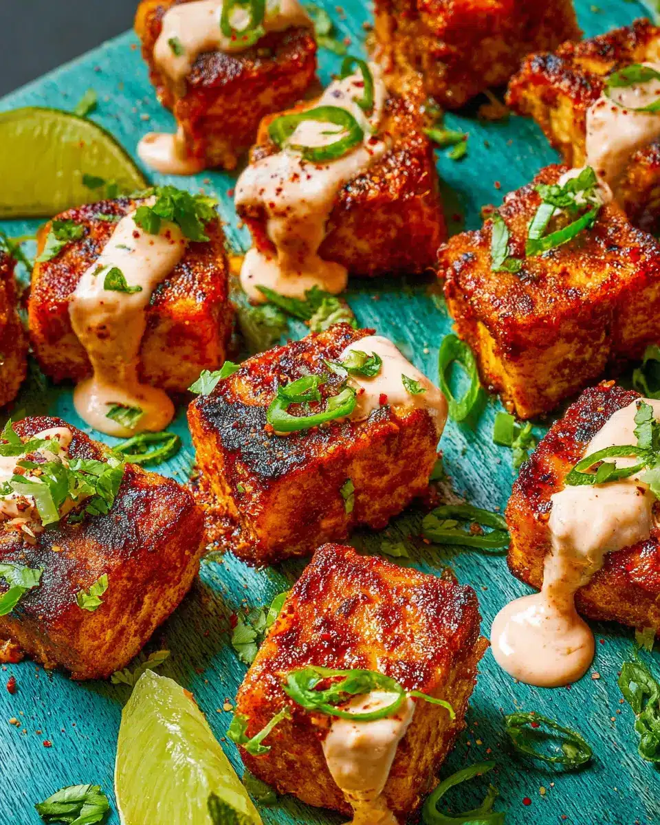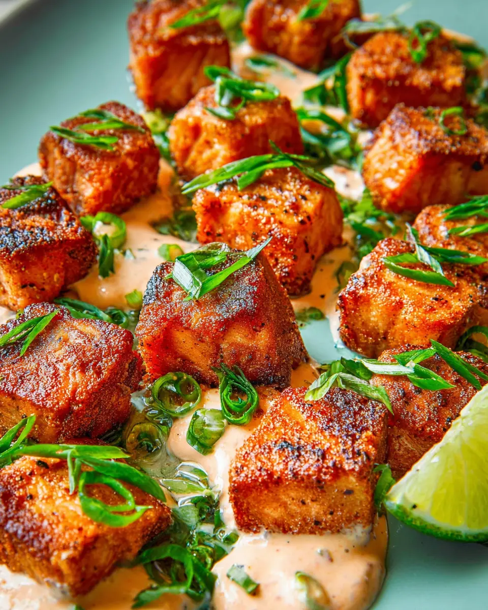 Once your salmon bites are beautifully crispy, transfer them to a serving platter. Squeeze some fresh lime juice over the top for an added burst of flavor. Drizzle the harissa-yogurt sauce over the salmon, and don’t forget to sprinkle on the finely chopped green onions.