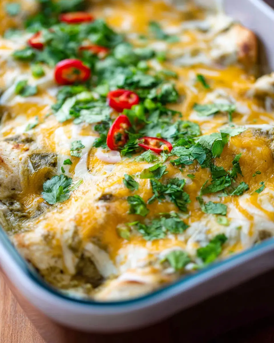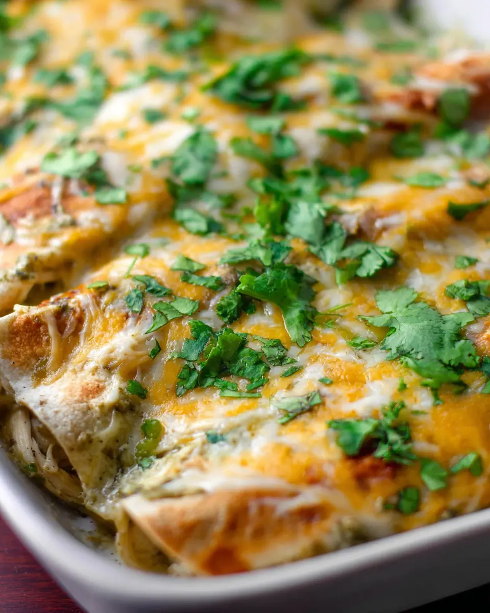 Finally, cover your baking dish with aluminum foil and pop it in the preheated oven for 15 minutes. After that, remove the foil and let it bake for an additional 10 minutes or until the cheese is bubbly and golden. Once it’s out of the oven, give it a few minutes to cool, allowing the flavors to set. Garnish with some fresh cilantro for that perfect finishing touch, and enjoy your homemade easy green chicken enchiladas!