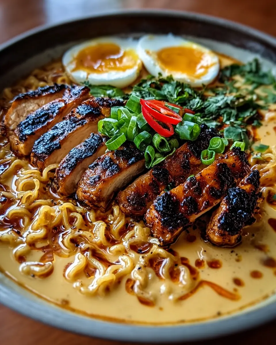 Fiery Chicken Ramen with Creamy Garlic Sauce