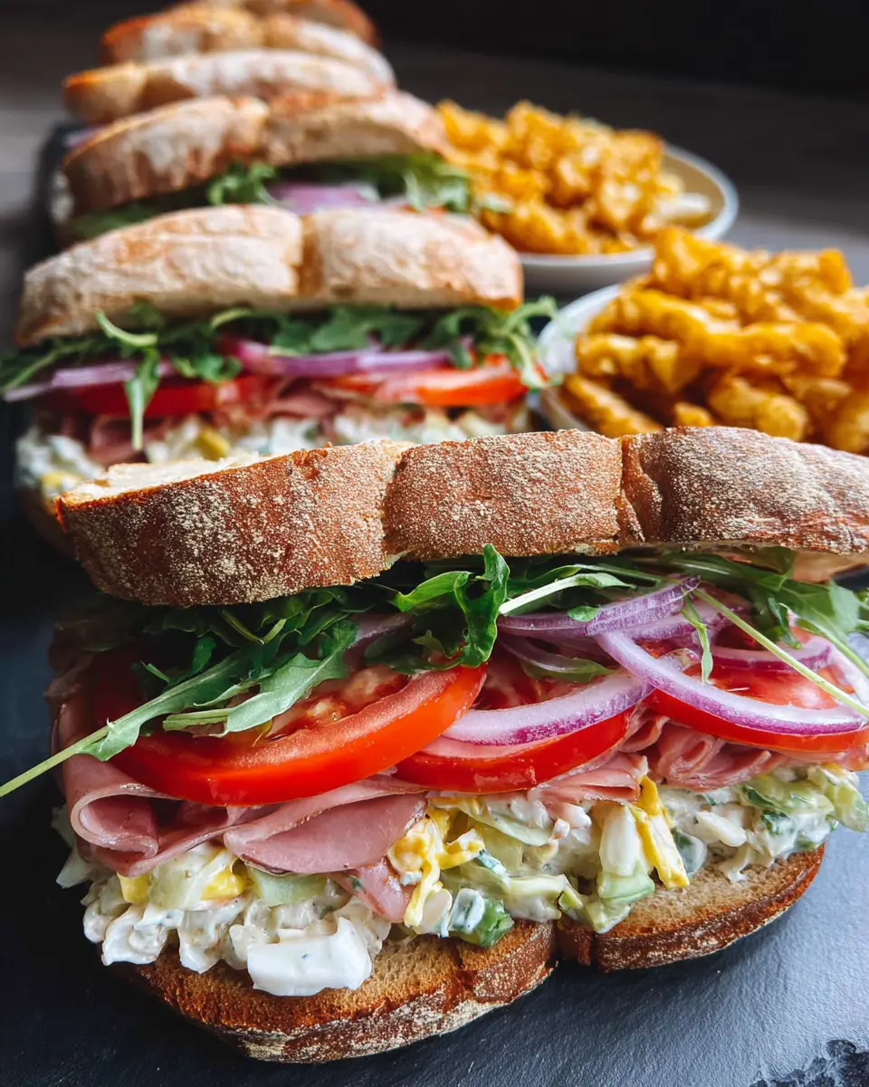 Grinder Salad Sandwiches are the delightful fusion of robust sandwich components with a refreshing salad twist. Originating from classic Italian sub sandwiches, these creations tantalize your taste buds by layering Chicken Ham, beef, or turkey bacon, all topped with a generous helping of fresh, crunchy salad. This sandwich trend is gaining popularity for good reason; they’re not only delicious but also versatile and healthy—perfect for busy young professionals who crave satisfying meals without the guilt.