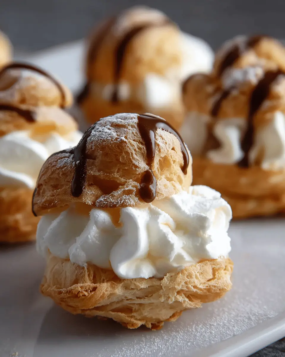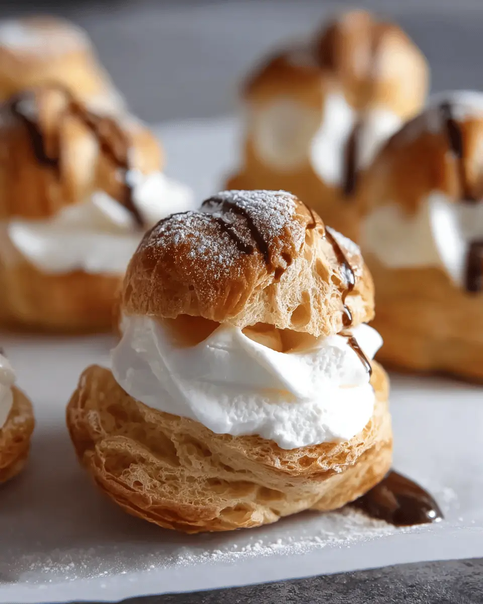 Indulge your chocolate cravings with these delightful chocolate cream puffs! Simply fold melted chocolate into the whipped cream filling for a rich and decadent twist. You can even drizzle some chocolate sauce over the puffs before serving for an extra treat. They pair wonderfully with a cup of coffee or espresso, making them the perfect dessert for a cozy evening.