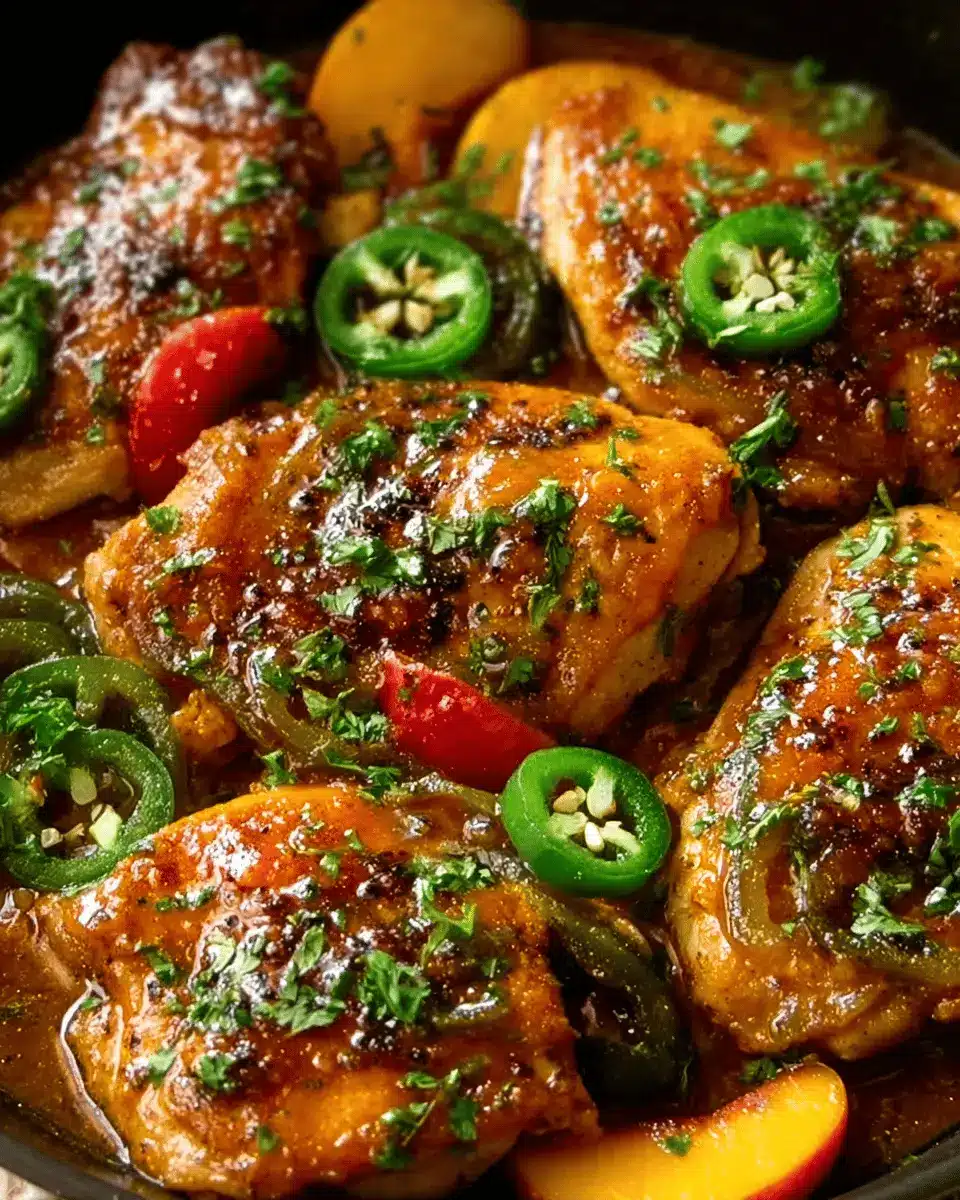 Finally, it’s time for the grand finale! Pour that sweet and tangy peach glaze into the skillet with jalapenos and peaches, ensuring everyone is coated evenly. Return the chicken to the skillet and spoon the delicious glaze over it for 1-2 minutes until warmed through.