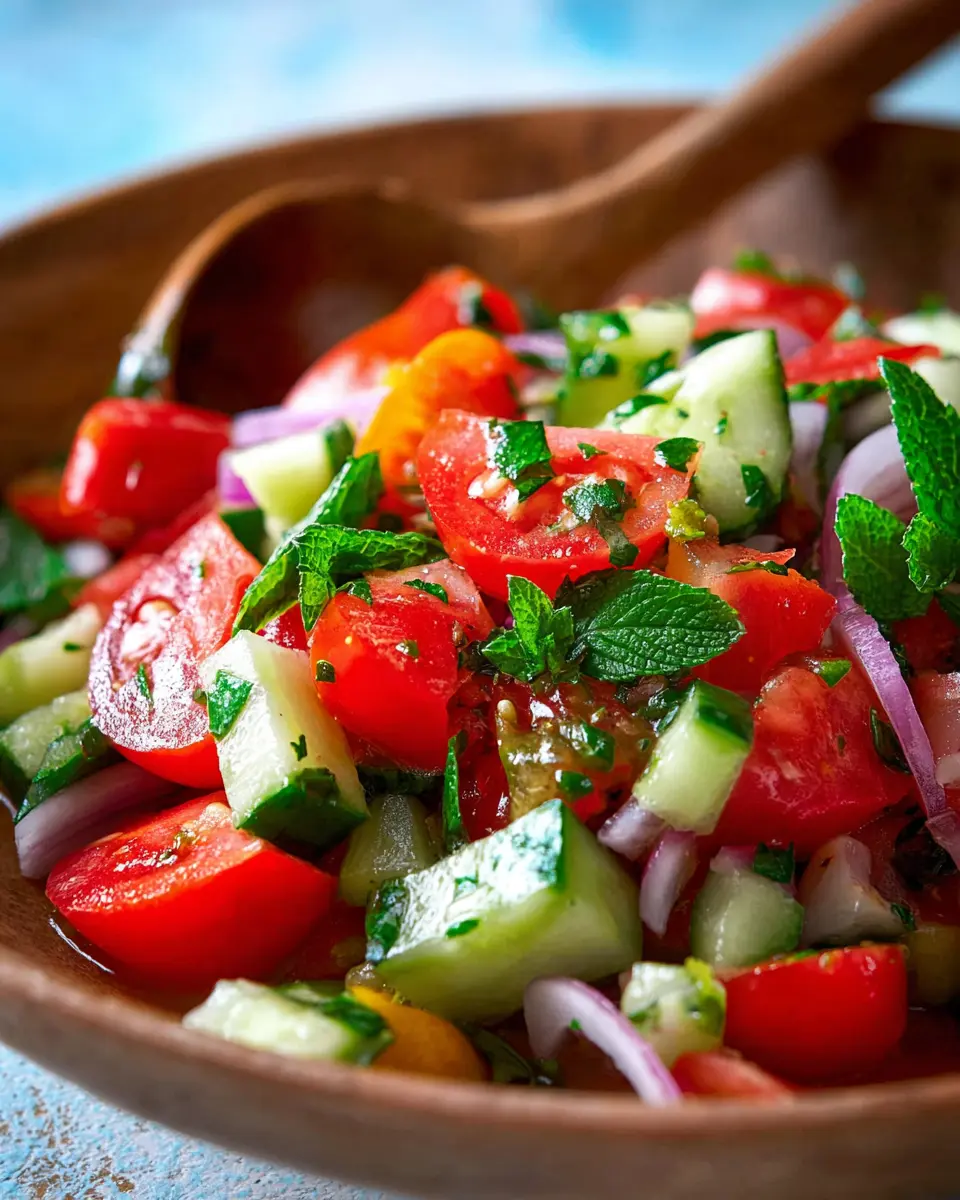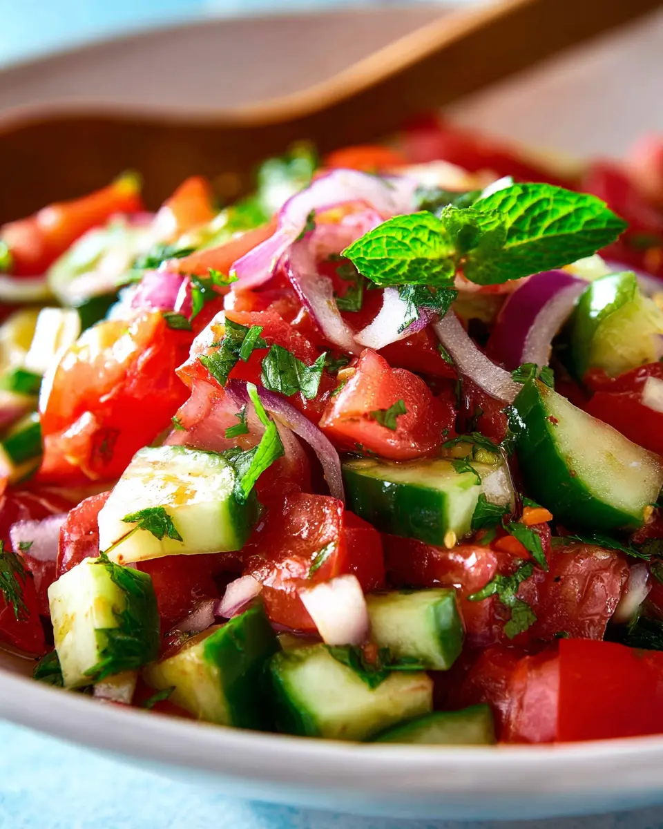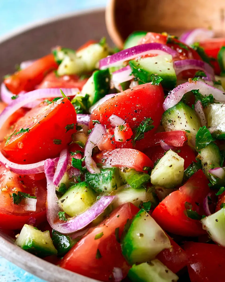 This salad truly shines on its own! The vibrant mix of ripe tomatoes and crunchy cucumbers is refreshing and satisfying, making it a perfect choice for lunch or a light dinner. If you’re looking to spice it up, sprinkle some crumbled feta or toasted chickpeas for an added layer of texture and flavor. It’s quick, nutritious, and bursting with Mediterranean flair!