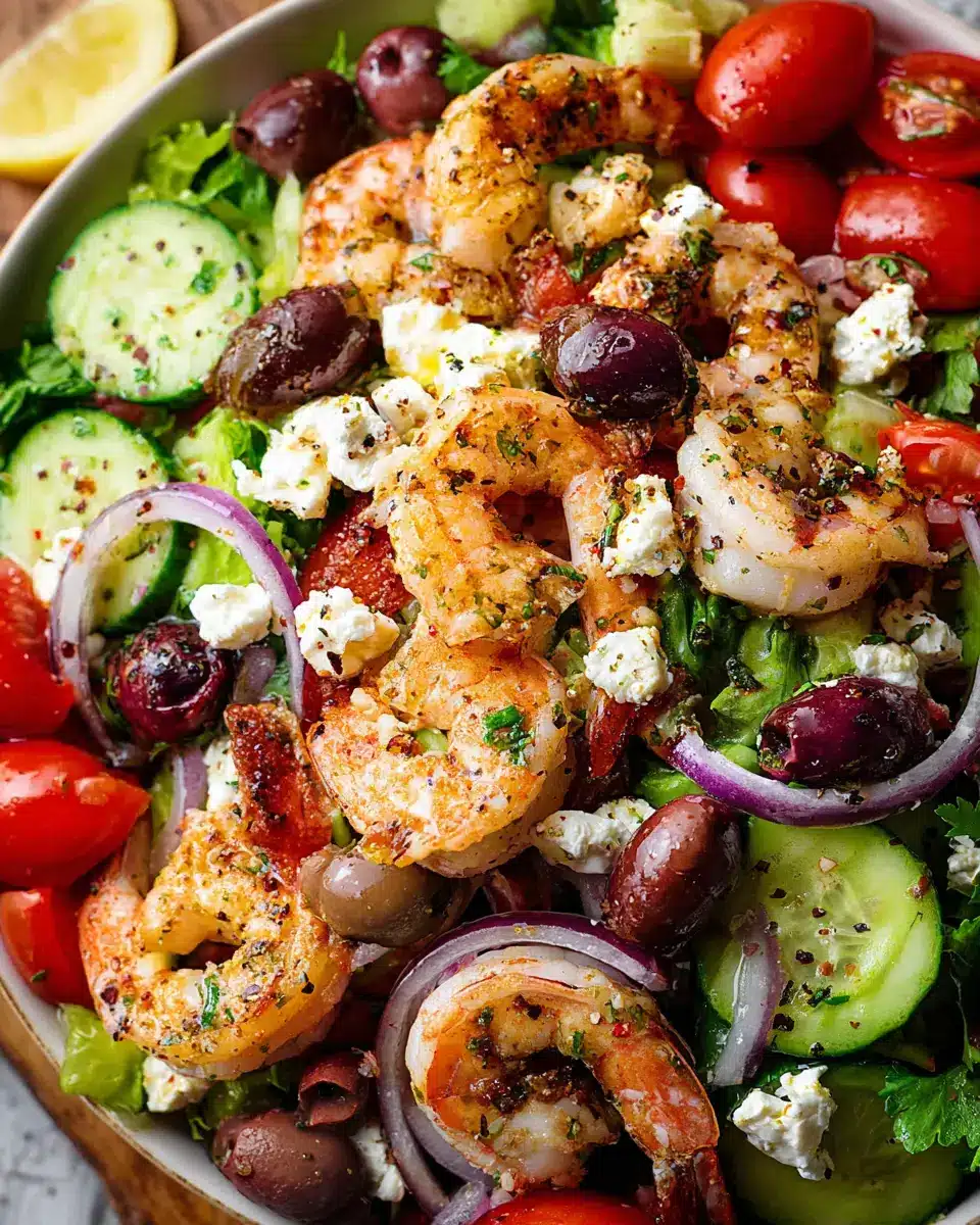 This vibrant salad features juicy shrimp, a medley of fresh vegetables, and delightful toppings like feta cheese that make every bite satisfying. Feeling peckish after a long day? This dish is full of protein-rich ingredients and wholesome fibers, offering a balanced meal that keeps you energized and fueled without the post-lunch slump. It’s a meal that leaves you feeling good, both physically and mentally.