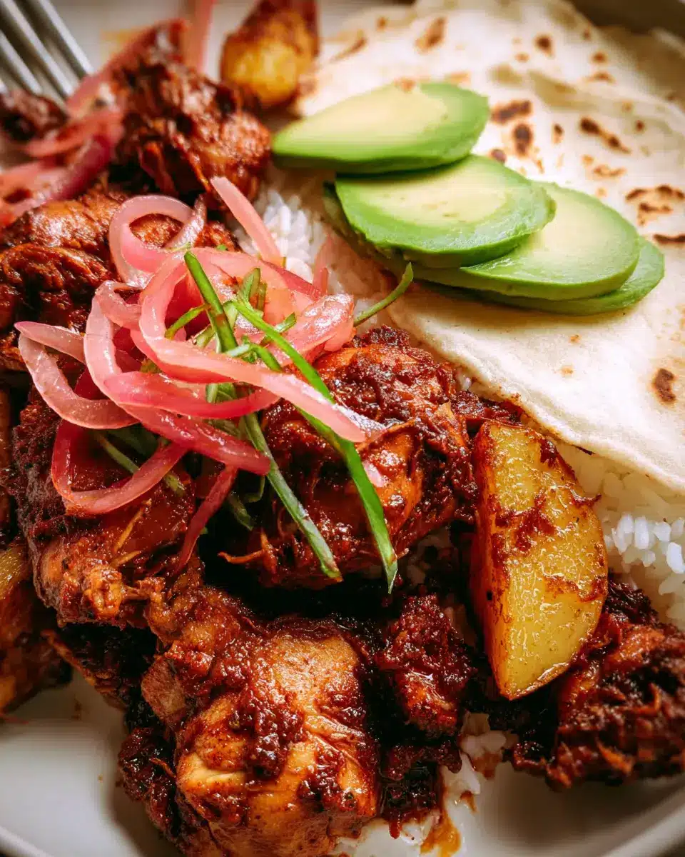 Mexican Adobo Chicken shines when served over a fluffy bed of rice, balancing its rich, spicy flavors. Try jasmine or basmati rice for a fragrant twist. Top it off with creamy, sliced avocados and crunchy Easy Pickled Red Onions for a zesty kick. If you're feeling adventurous, add Crispy Fried Potatoes for an unexpected crunch. You can also wrap everything in warm corn or flour tortillas for a delightful handheld meal.