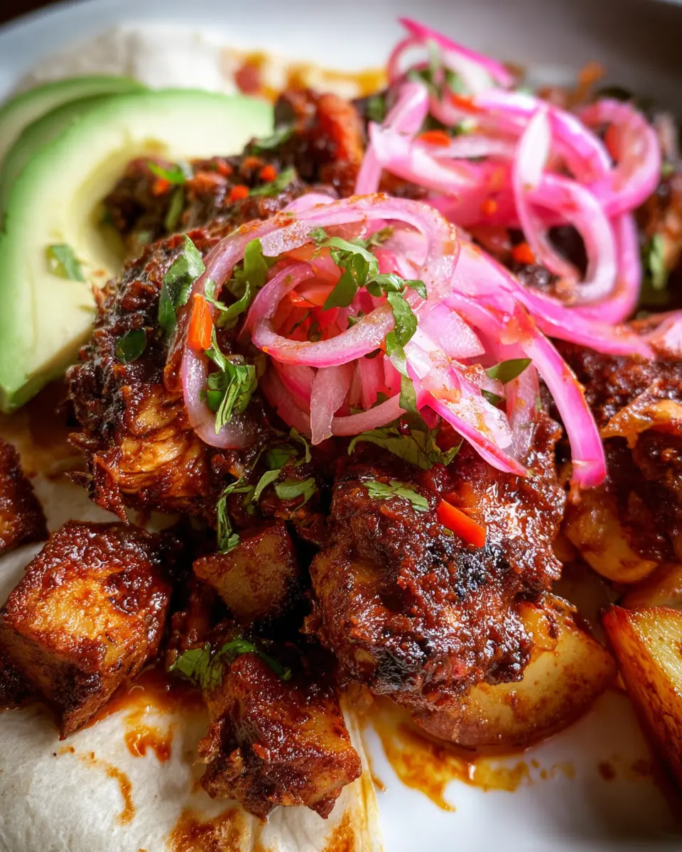 When it’s time to serve, place a generous helping of cooked rice on each plate and lay the adobo chicken on top. Accent your dish with sliced avocado and a sprinkle of pickled onions for a pop of flavor and color. If you’re feeling extra indulgent, don’t forget those crispy fried potatoes and warm tortillas on the side. This hearty meal is perfect for sharing—just sit back and watch your friends dig in!