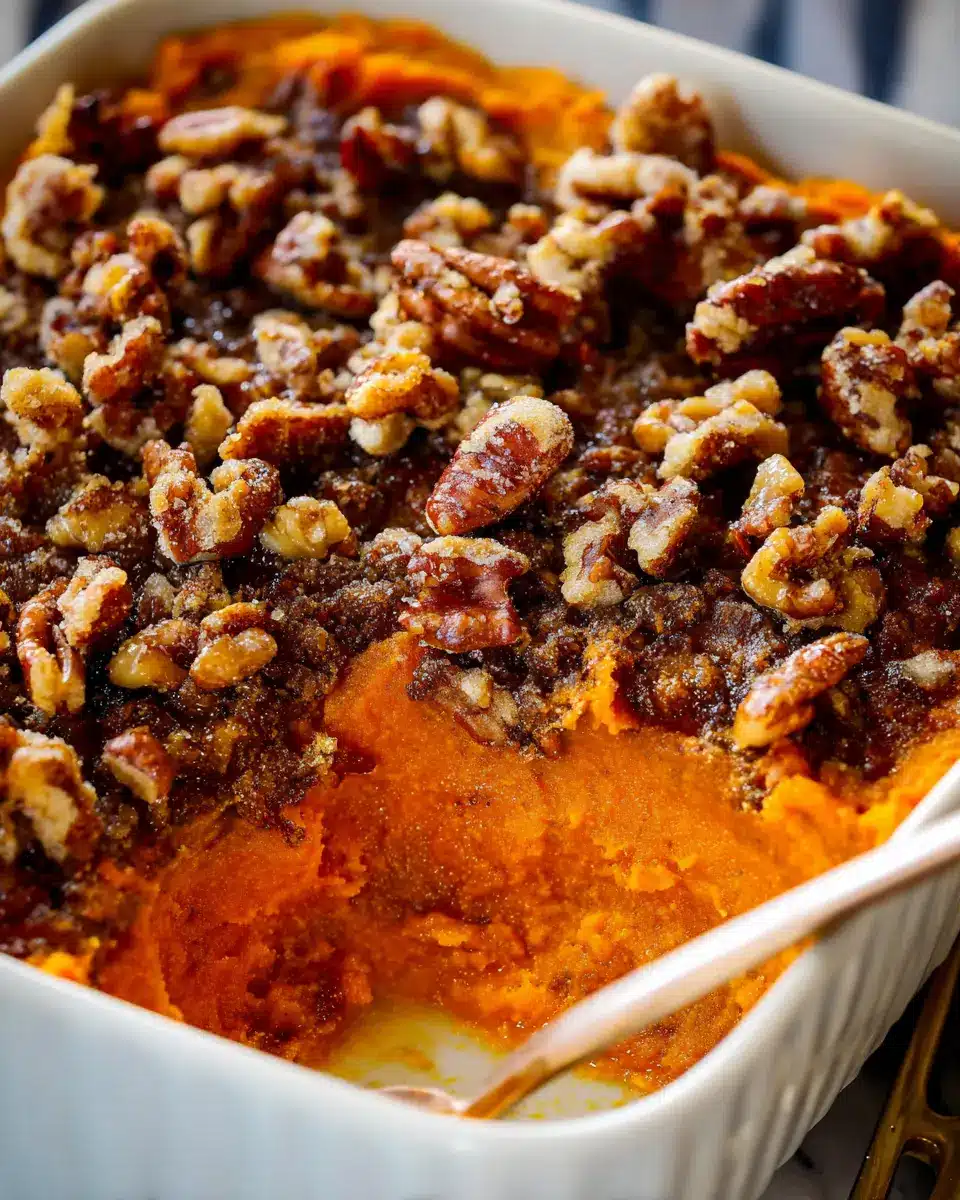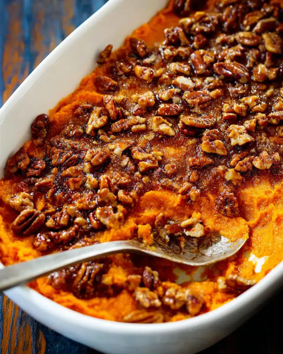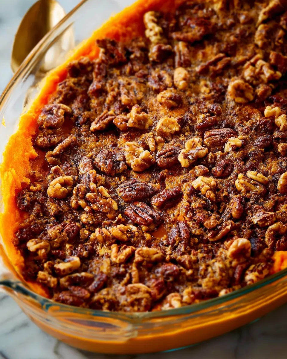 This topping adds the perfect crunchy contrast to your pecan sweet potato casserole, making it an irresistible side dish for any holiday table or family gathering.