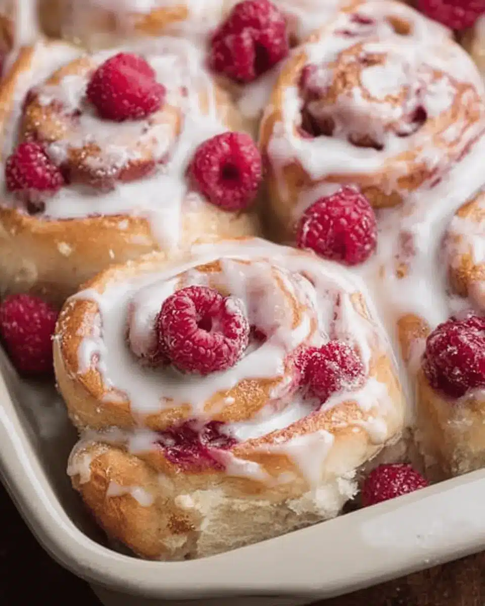 - Drizzle the glaze over the Raspberry Sweet Rolls while they are still warm in the dish.