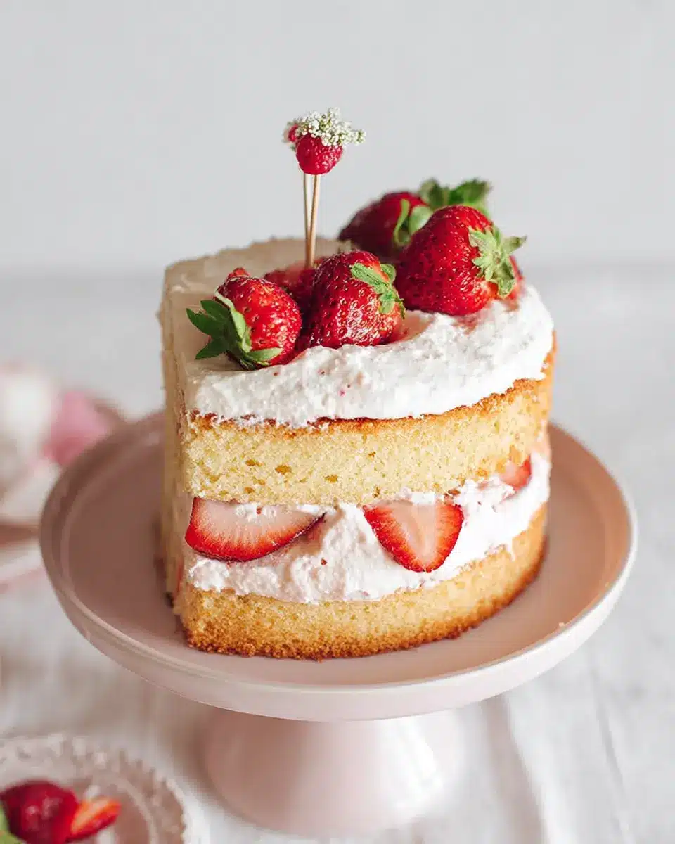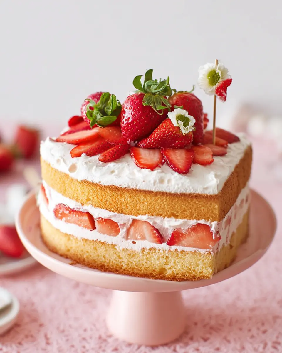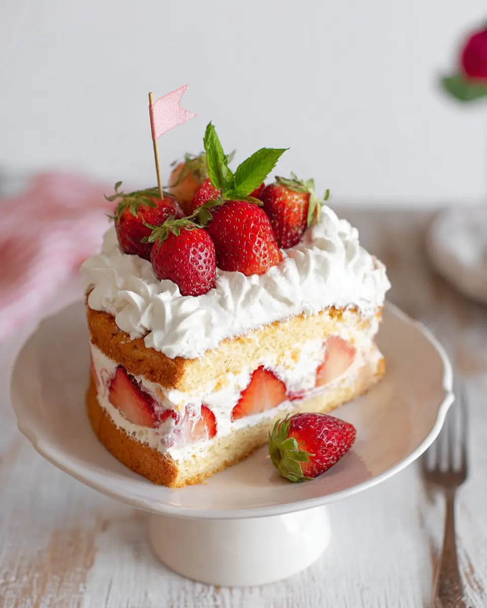This cake has about 30 grams of sugar per slice, primarily from the sweetened whipped cream and fresh strawberries, perfectly complementing the vanilla sponge.