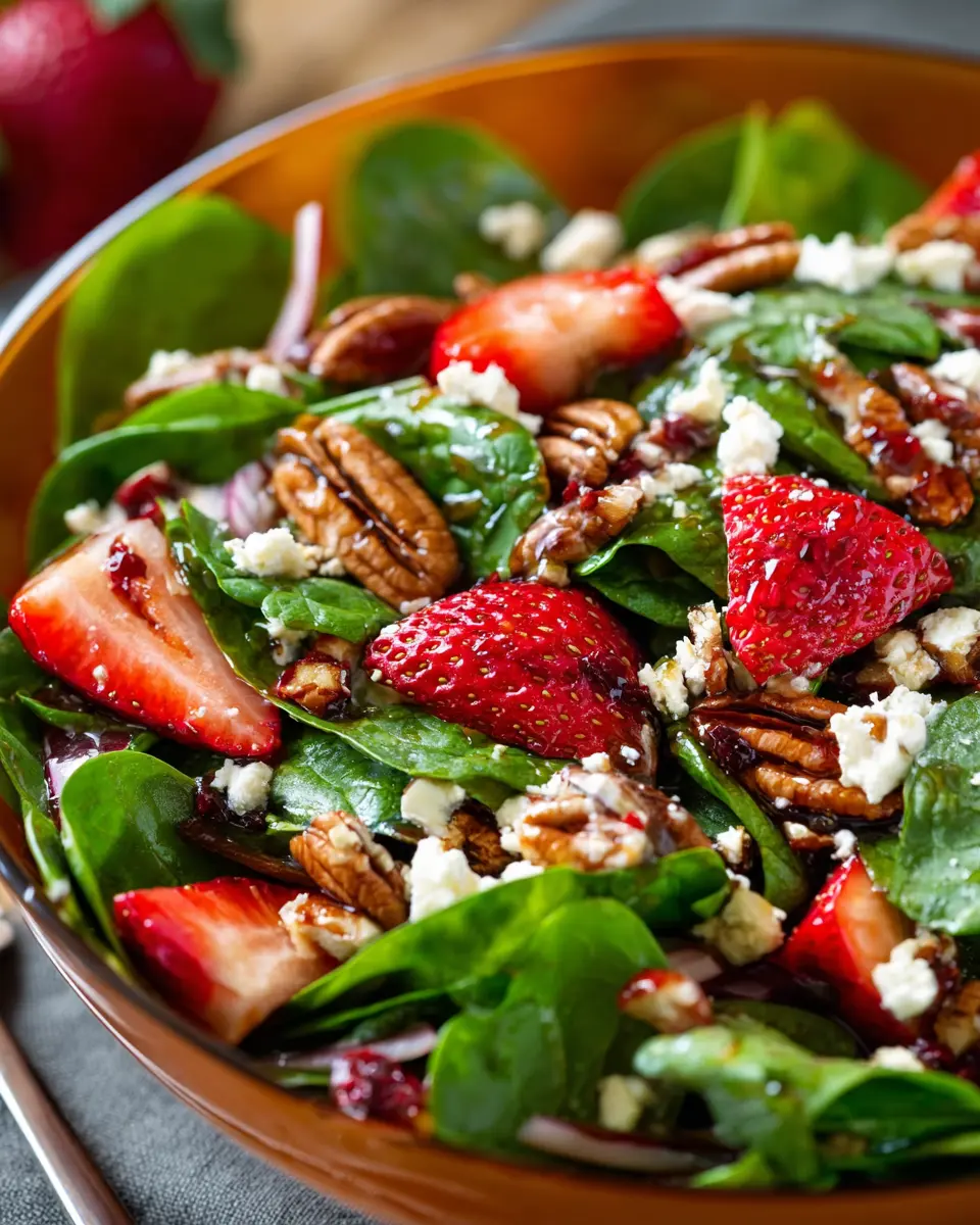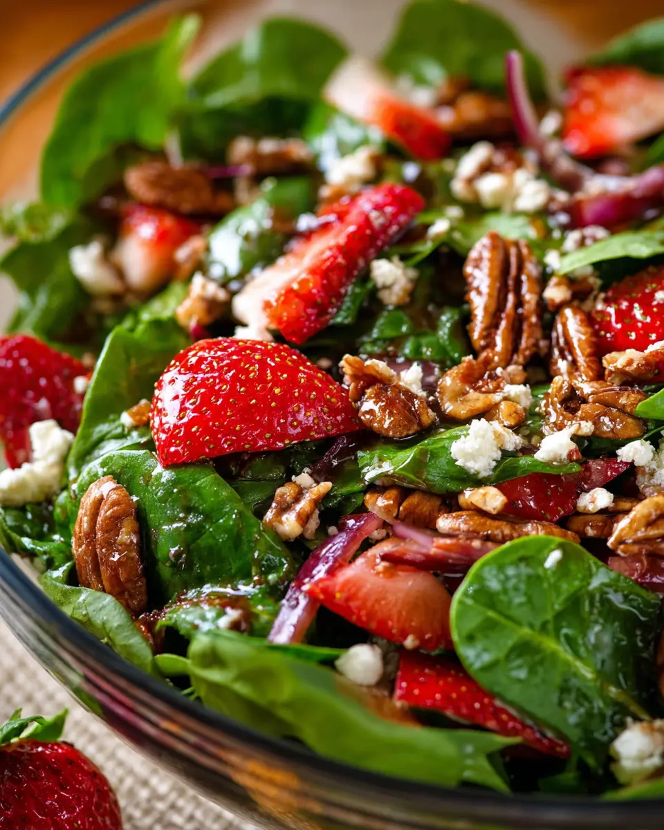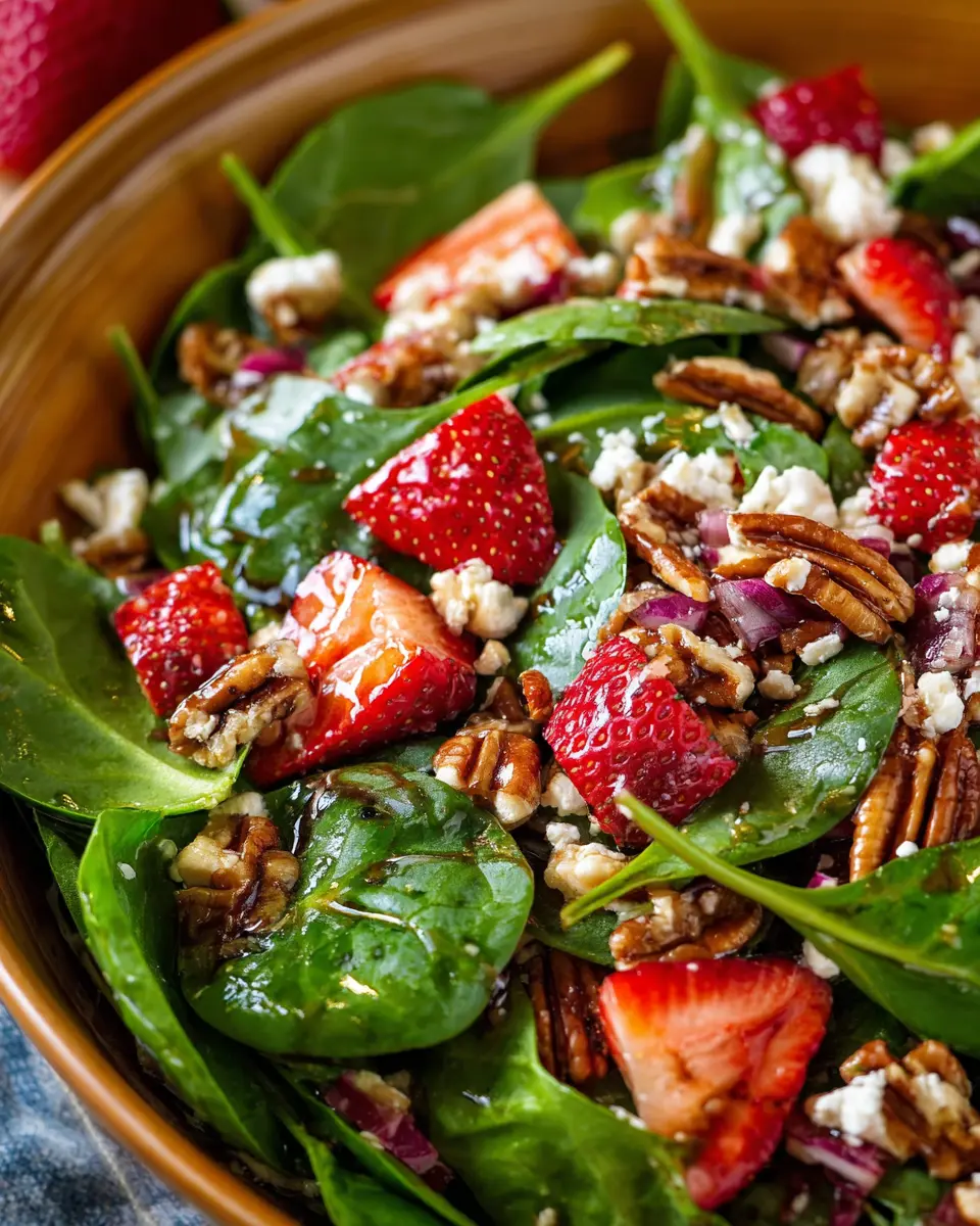 For busy schedules, you can prepare the strawberry spinach salad ahead. Wash and dry the spinach, slice the strawberries, and make the candied pecans in advance. Assemble the salad just before serving for the best taste and crunch. You can whip up the vinaigrette and keep it ready in the fridge—just give it a good shake before drizzling!