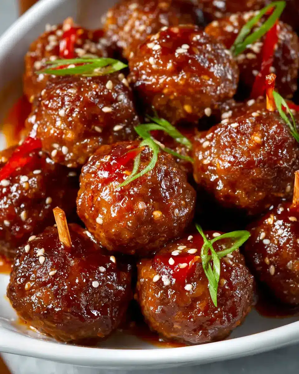 Once the meatballs are done, carefully remove them from the oven. Brush them generously with your sweet chili glaze—don’t hold back; you want every bite to be packed with flavor! Return them to the oven for another 5 to 7 minutes to caramelize the glaze. Finally, sprinkle some toasted sesame seeds over the top just before serving for that perfect finishing touch.